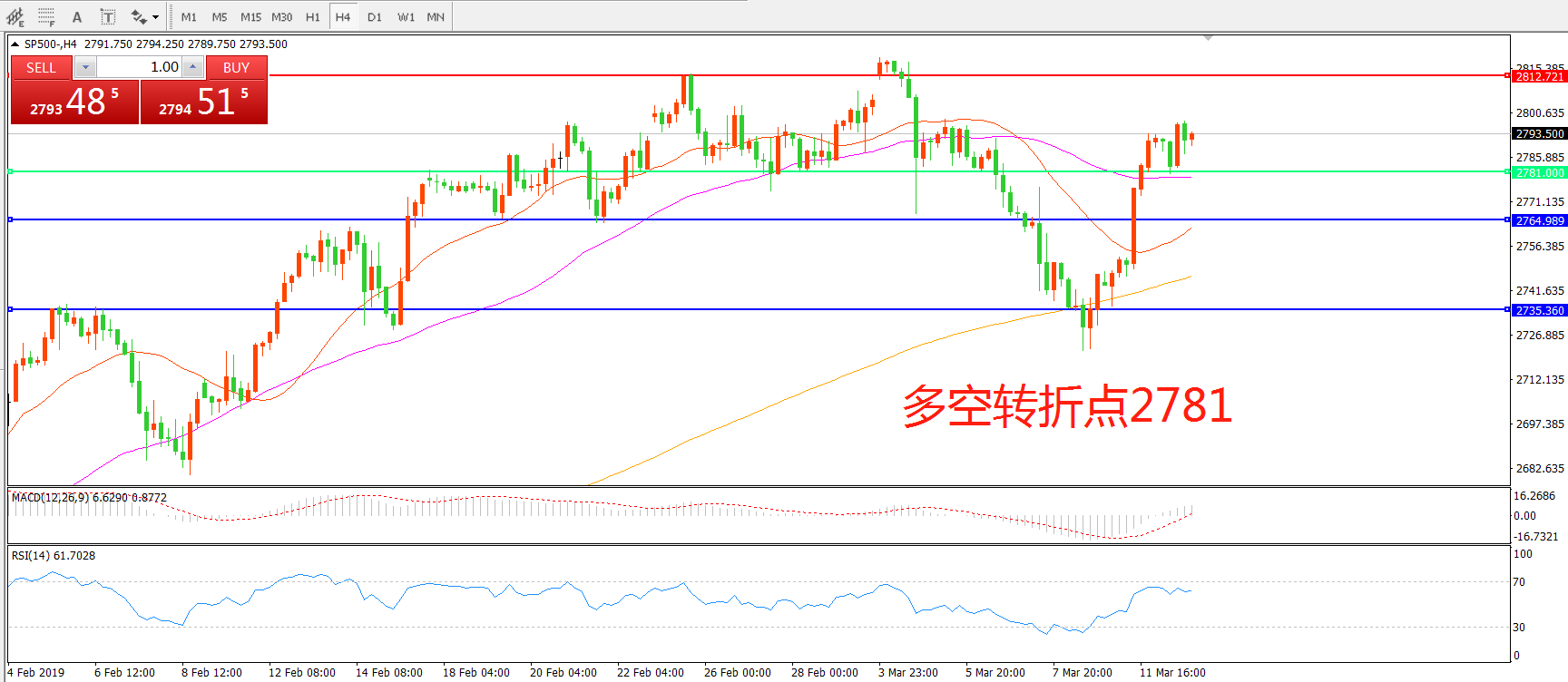 4小时图看,标普500触碰200周期均线后连续反弹,整体走势十分强势,21均线逐渐拐头,55均线走平,MACD红柱增加,RSI指标拐头,日内延续上行概率较大。