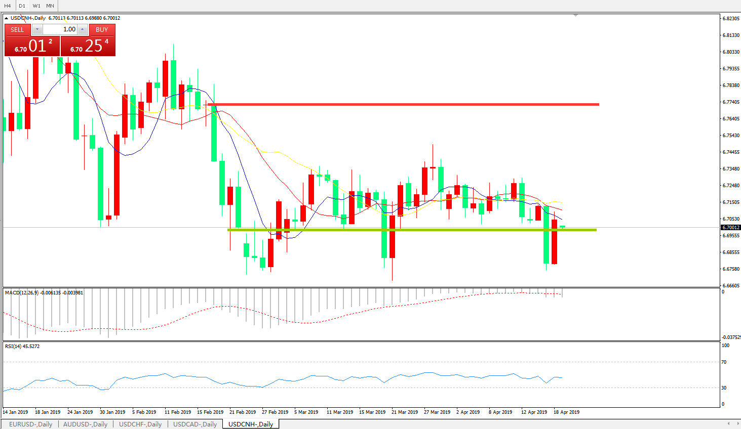备选策略: 6.6990之下,看跌,目标价位为6.6730,然后为6.6325