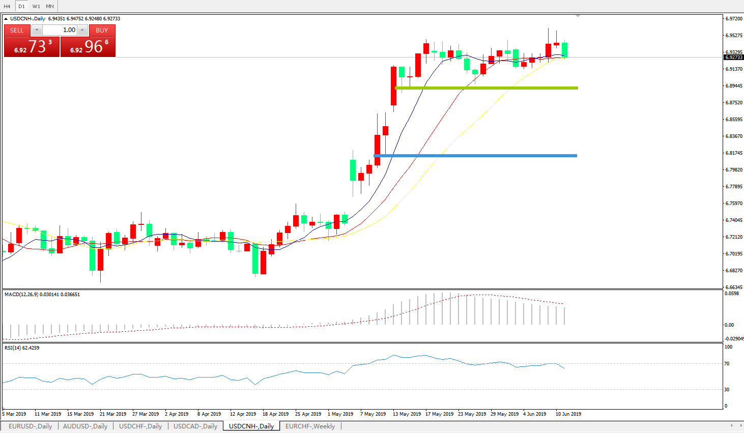 技术面简析:日线图均线粘合但整体维持攻势,MACD在0轴上方运行但动能柱轻微缩量,RSI超买区域拐头下行,汇价强力上攻后宽幅强势整理,预计短期汇价有整理回落需求,中期重点关注中美贸易争端后续进展。