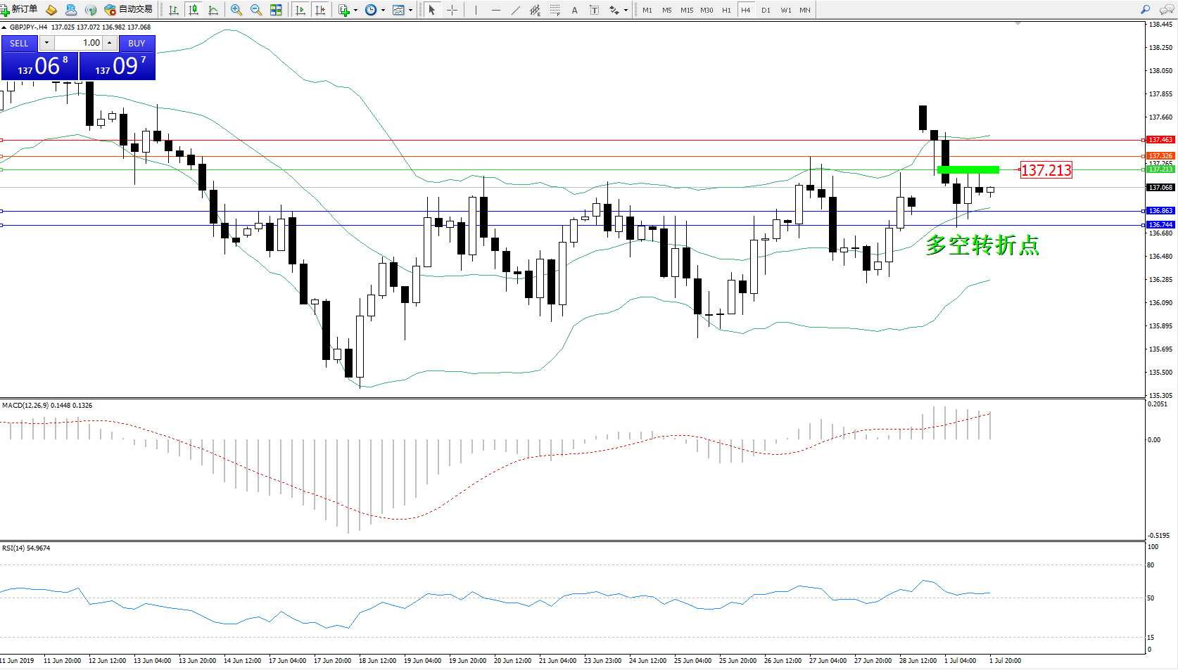 备选策略:137.213上方看涨,目标137.326、137.463