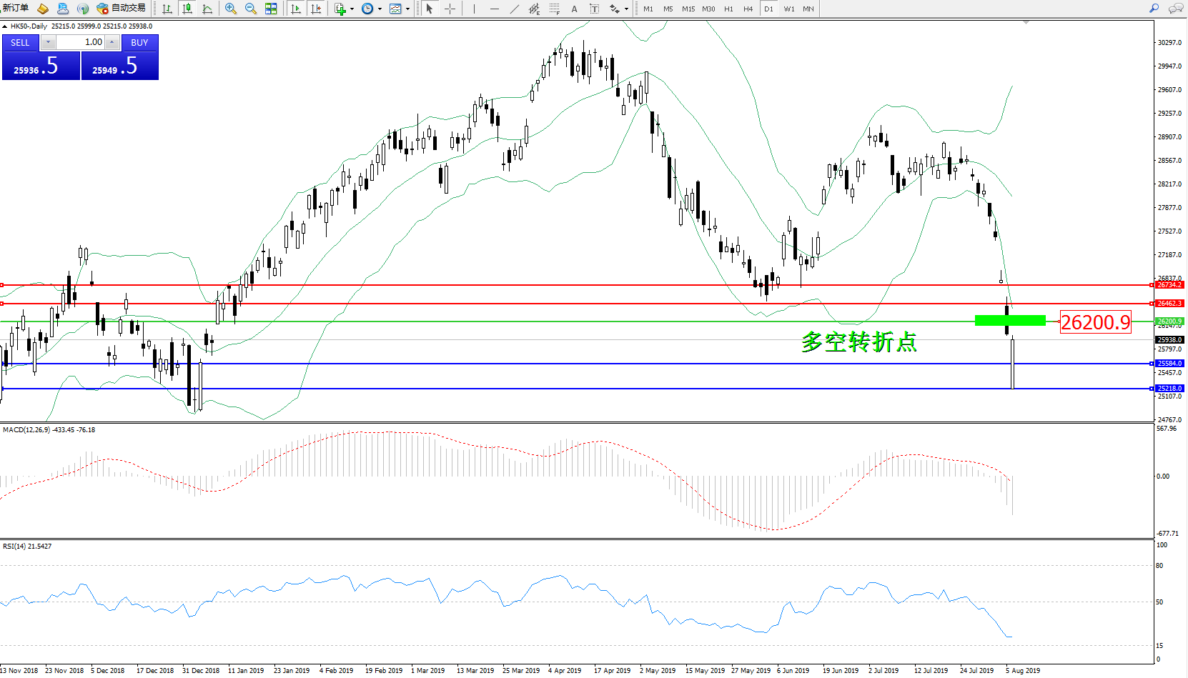 香港恒生指数大幅低开后震荡回升,逐渐收窄跌幅,截至收盘跌0.67%,报25976.24点。欧美股市全面大幅低开,道指低开近600点,即破26000大关,最多跌961点。受其外围影响,恒生指数继续大幅低开2.6%,一度跌破25400点,随后开始震荡回升,半小时反弹逾400点,恒指呈4连阴走势,4个交易日累跌近1800点,创1月9日以来低位,并补回大部分当天出现之上升裂口。预料恒指首个重要支持在26000水平。全日上升股份233只,下跌1595只,港股市场蓝筹业绩缺乏亮点,短线大市未有利好消息刺激,恒指或继续大幅走软。