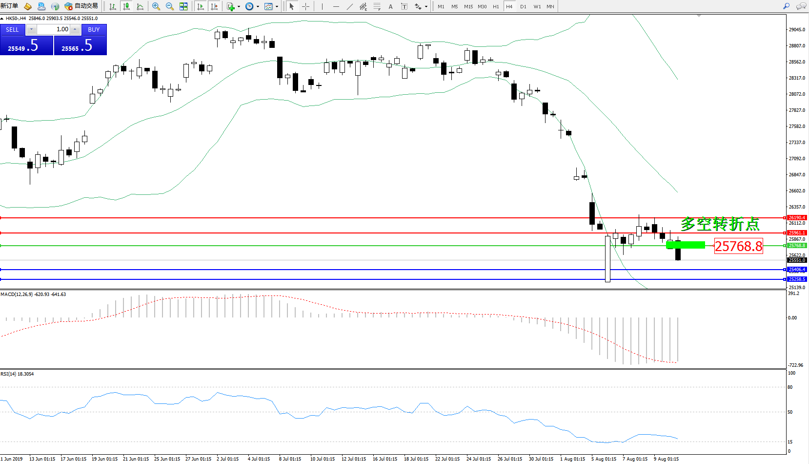 香港恒生指数8月12日(周一)收盘下跌114.58点,跌幅0.44%,报25824.72点;恒指低开0.27%,之后走势反复,盘中一度涨近0.5%,重回26000点,港股上周再度出现显著波动,毕竟困扰市场变数仍多,目前整体仍暂处于震荡格局中,ADR指数预示恒指今日或高开。指数在进入超卖区域之后往往会出现反弹,单是贸易最新局势及演化已教投资者无所适从。关注内地零售销售数据以及蓝筹业绩表现。由于缺乏足够催化剂,此前接连失守多个支持位的港股进一步上攻的动力不足,后市反弹后或有一定下跌空间。