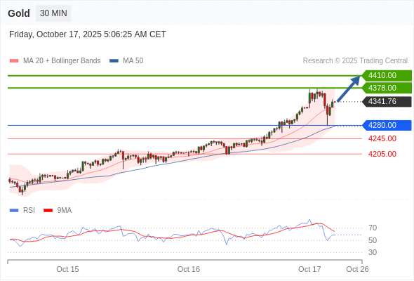 在 4280.00 之上,看涨,目标价位为 4378.00 ,然后为 4410.00 。