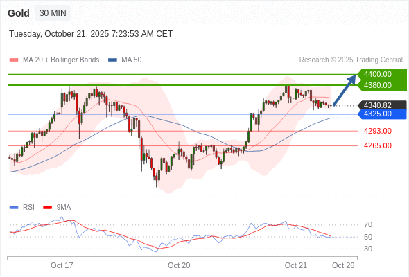 在 4325.00 之上,看涨,目标价位为 4380.00 ,然后为 4400.00 。