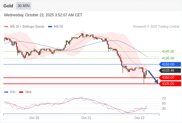 交易策略: 在 4150.00 之下,看跌,目标价位为 4050.00 ,然后为 4005.00 。