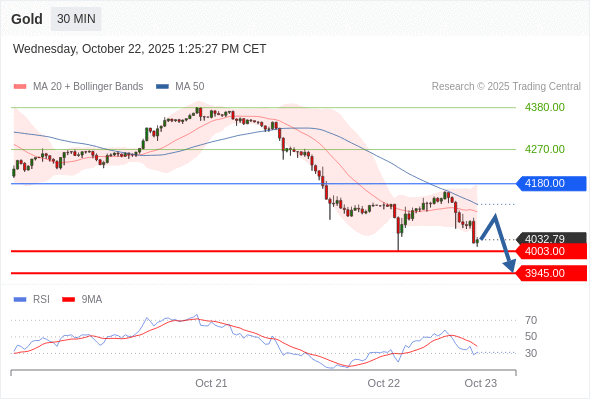 交易策略: 在 4180.00 之下,看跌,目标价位为 4003.00 ,然后为 3945.00 。