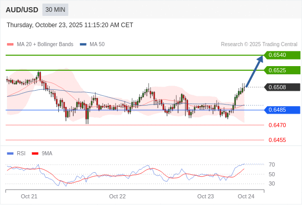 在 0.6485 之上,看涨,目标价位为 0.6525 ,然后为 0.6540 。