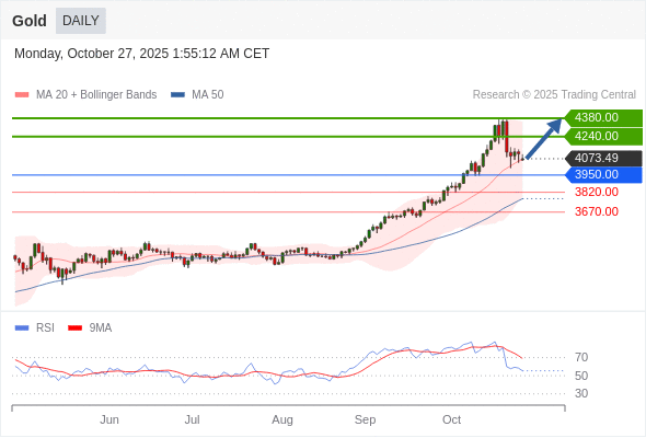 在 3950.00 之上,看涨,目标价位为 4240.00 ,然后为 4380.00 。