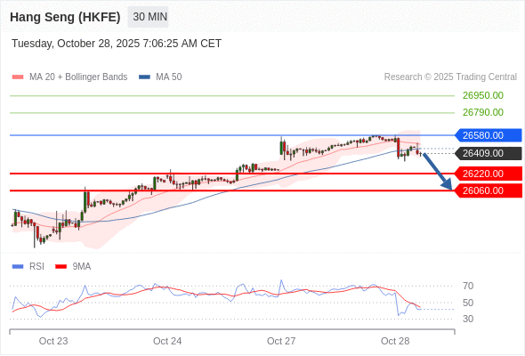 交易策略: 在 26580.00 之下,看跌,目标价位为 26220.00 ,然后为 26060.00 。