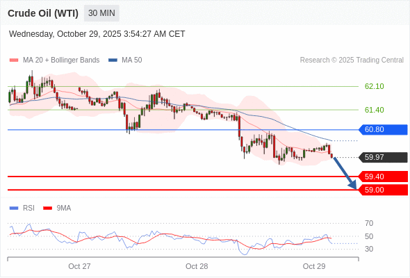 在 60.80 之下,看跌,目标价位为 59.40 ,然后为 59.00 。