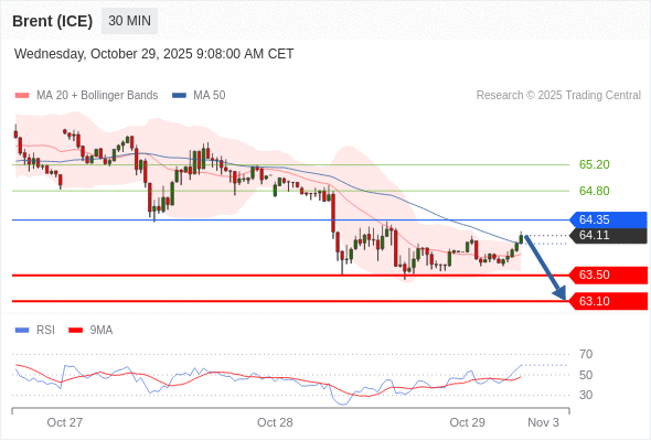 在 64.35 之下,看跌,目标价位为 63.50 ,然后为 63.10 。