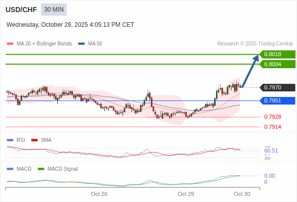 美元/瑞郎 当日内 : 看涨,当 0.7951 为支撑位。