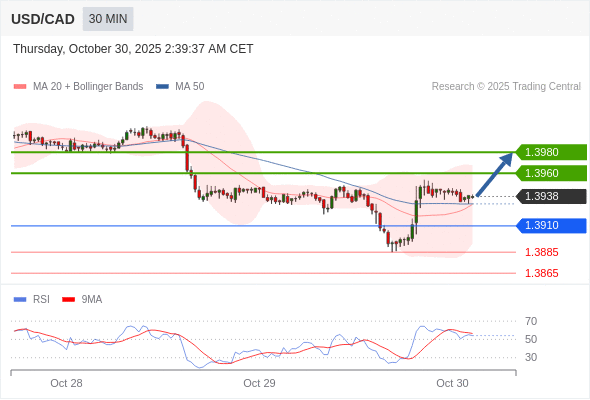 在 1.3910 之上,看涨,目标价位为 1.3960 ,然后为 1.3980 。