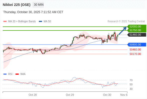 交易策略: 在 50800.00 之上,看涨,目标价位为 51750.00 ,然后为 52000.00 。