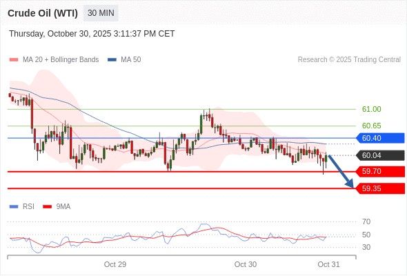 在 60.40 之下,看跌,目标价位为 59.70 ,然后为 59.35 。