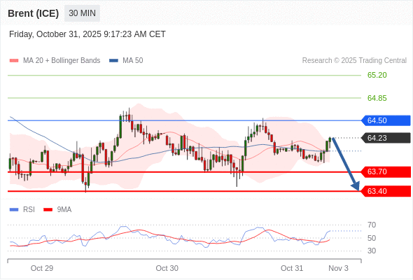 在 64.50 之下,看跌,目标价位为 63.70 ,然后为 63.40 。