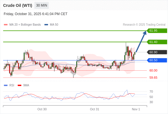在 60.50 之上,看涨,目标价位为 61.40 ,然后为 61.95 。