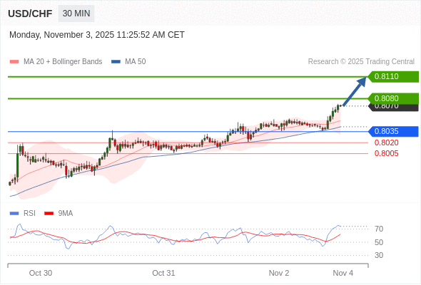 在 0.8035 之上,看涨,目标价位为 0.8080 ,然后为 0.8110 。