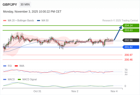 英镑/日元 当日内: 看涨,当 201.82 为支撑位。