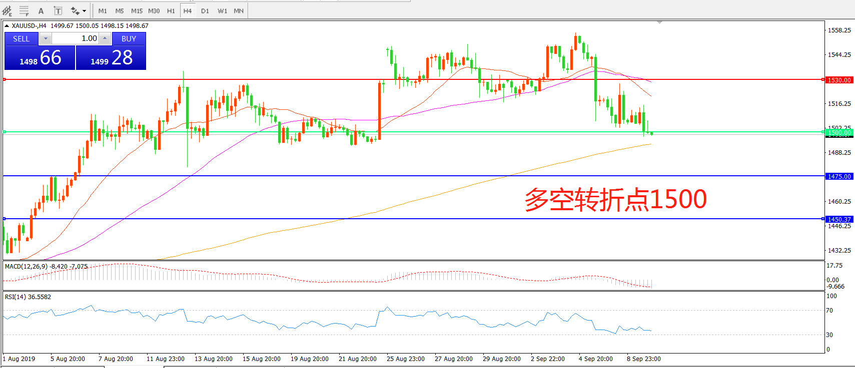 周一(9月9日),英国硬脱欧担忧缓和,全球央行宽松的预期犹存打压了市场中的避险情绪,现货金价维持震荡下行,跌破千五关口,收报1498.47美元/盎司。虽然市场情绪略有好转的,但市场的风险还是实实在在存在的。美国债券收益率曲线倒挂这一衰退信号的出现,令市场感到不安,在全球央行都降息的情况下,黄金的支撑依然较强。