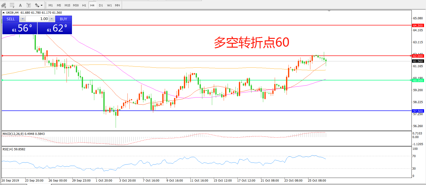 4小时图看,油价呈现冲高回落走势,触碰62美元阻力后震荡下行,但短期走势依然偏强,短期均线拐头向上,MACD红柱减少,RSI指标走平,日内延续上行概率较大。