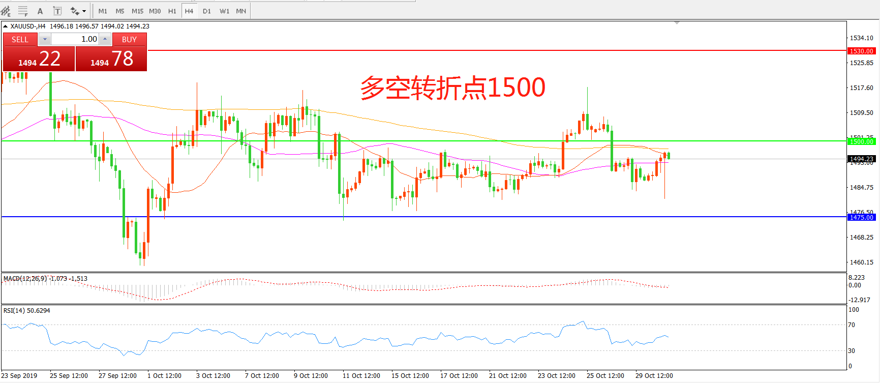 周三(10月30日),美联储开启年内第三次降息。将联邦基金利率目标区间下调25个基点至1.50%-1.75%,符合预期。鲍威尔在会后发言中表示目前货币政策是宽松的,但放松政策的举措可能接近停顿,这被市场解读为一种鹰派信号。现货黄金一度短线下挫逾4美元,随后收复失地,最终收报1495.71美元/盎司。