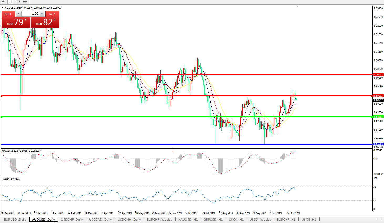 澳元兑美元高位震荡,市场静待周二澳洲联储更多指引; 澳元兑美元周一在0.69上方的区间高位震荡,上周以来美元指数的持续颓势,以及国际贸易领域的乐观情绪,都对澳元汇价起到了支撑作用。然而,周二澳洲联储政策决议在即这一事件,却令多头暂缓了追高澳元的步伐;虽然,市场并不太多预计澳洲联储在周二的会议上再度降息,但是在美联储上周利率“三联降”之后,澳洲联储面对之后的政策预期给出指引却是必须的功课。这之中蕴藏的不确定性令投资者暂时采取了观望姿态;同时,澳元在继续上行途中,还面临着趋势阻力的打压。目前,在0.6954处的200日均线依旧看似不可憾动,自20183月以来,澳元兑美元日线收盘始终未能站上过200日均线。欲突破这一阻力需要更强大的利多消息推动,绝非澳洲联储在周二暂缓降息即可。而一旦升破,也就意味着中期反转走势的正式开始