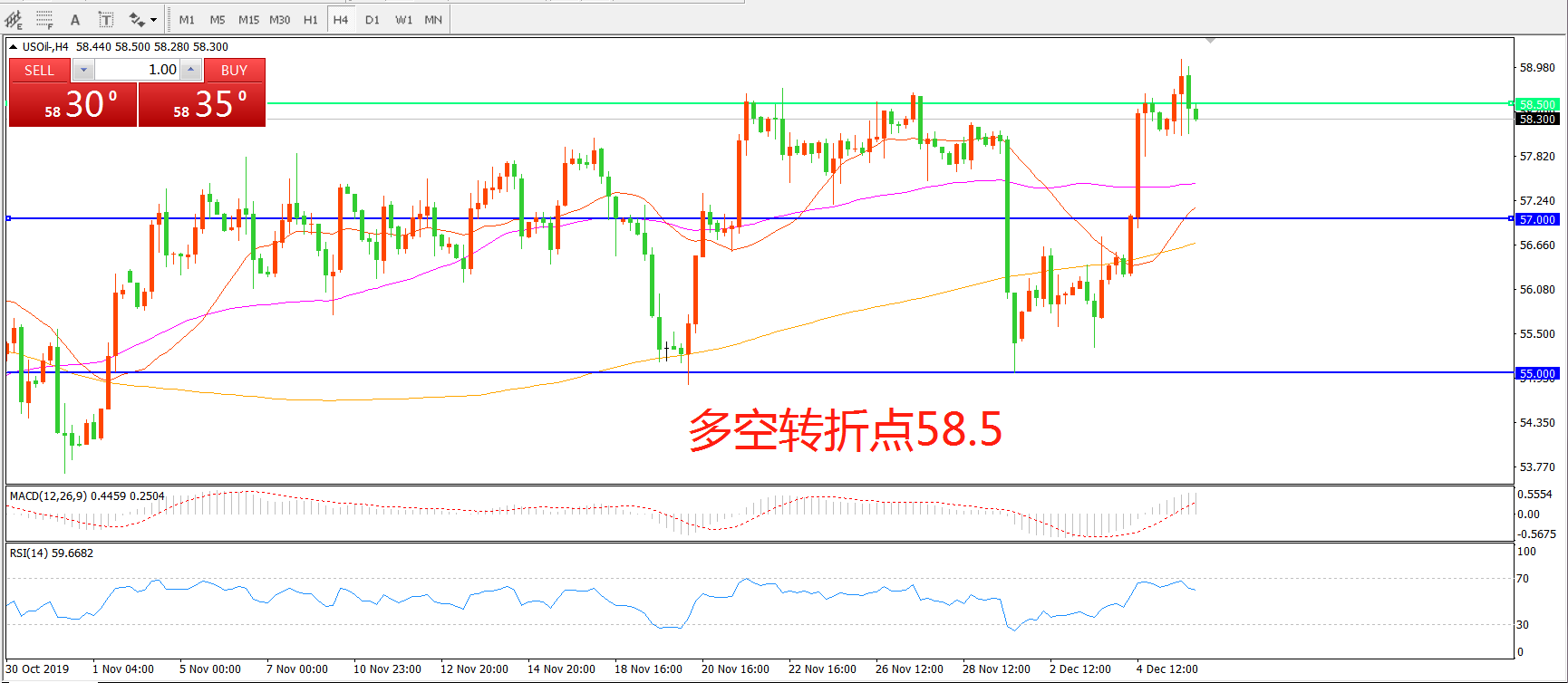 周四(12月5日) ,OPEC成员国在维也纳召开会议,目前市场预计各成员国将同意进一步减产,以支撑油价,有消息称沙特和俄罗斯都已经建议扩大减产,在现有120万桶/日的基础上额外减产50万桶/日,目前各方仍在等待减产会议的最终结果 美国WTI原油冲高回落,收报58.30美元/桶。OPEC+将在周五的会议上就更新的减产协议进行投票,市场各方目前都在等待会后声明的公布。