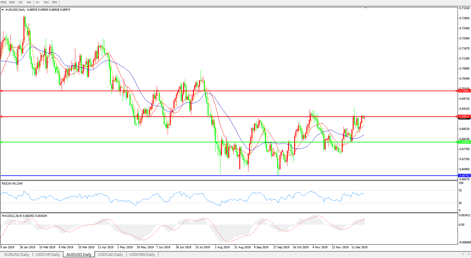 澳元兑美元在周五延续了此前在周四因为澳洲就业数据意外大好而录得的涨幅,但仍在0.69关口遇阻,在圣诞节假期下周即将到来的背景下,市场整体情绪仍偏于谨慎。在澳洲联储1月份并无例会的背景下,投资者正倾向于观望后市更多经济数据,来研判其2020年政策预期; 这也意味着从技术角度来看,澳元兑美元仍无法有效突破200日均线阻力位启动中期反转。虽然前期给经济贸易领域的利多消息对澳元构成提振,但是进入2020年之后的进一步进展才是关键。短线来看,上方关键阻力位在0.6905,而下方若跌破本周前期的0.6838双底,则意味着跌势的再续。在圣诞假期临近时,汇价短线可能陷入横盘这震荡,但仍需警惕全球可能出现的“黑天鹅”消息