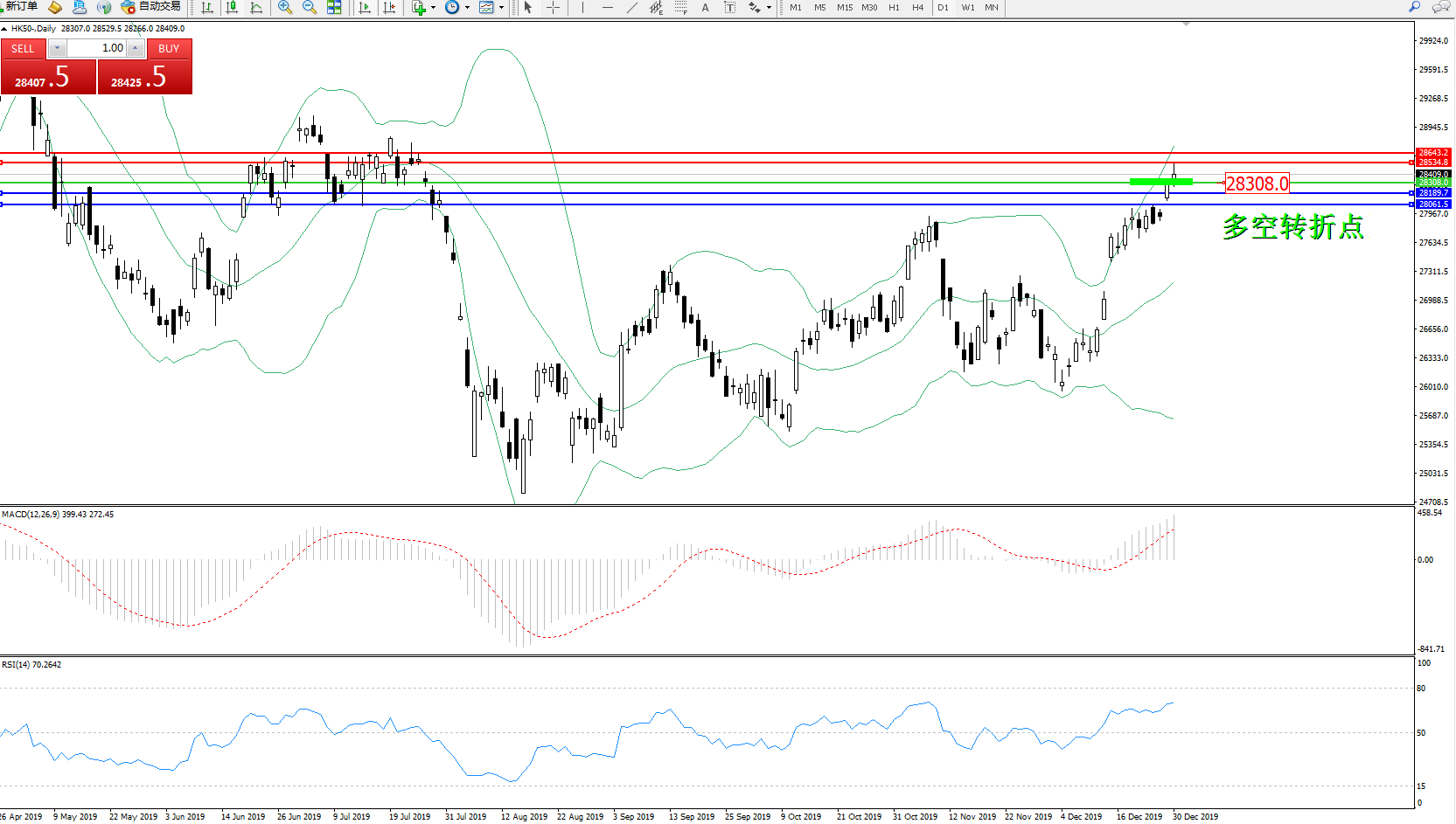 香港恒生指数12月30日(周一)收盘上涨93.97点,涨幅0.33%,报28319.39点;港股早上小幅高开25点后,略呈沽压而回落倒跌60点,恒指低见28165。唯低位有买盘支持,反弹再倒升,最高见28418,随后续在高位横行。市场已对第一阶段协议形成良好预期,接下来将憧憬更进一步的发展。隔夜美国股市在2019年辉煌一年的倒数第二天走低,投资者在假期前夕市场淡静之际谨慎行事。此外,由于美联储处于按兵不动的状态,而且美国贸易谈判似乎距离新突破还很遥远,因此交易员可能仍然不愿重新投入高风险市场。