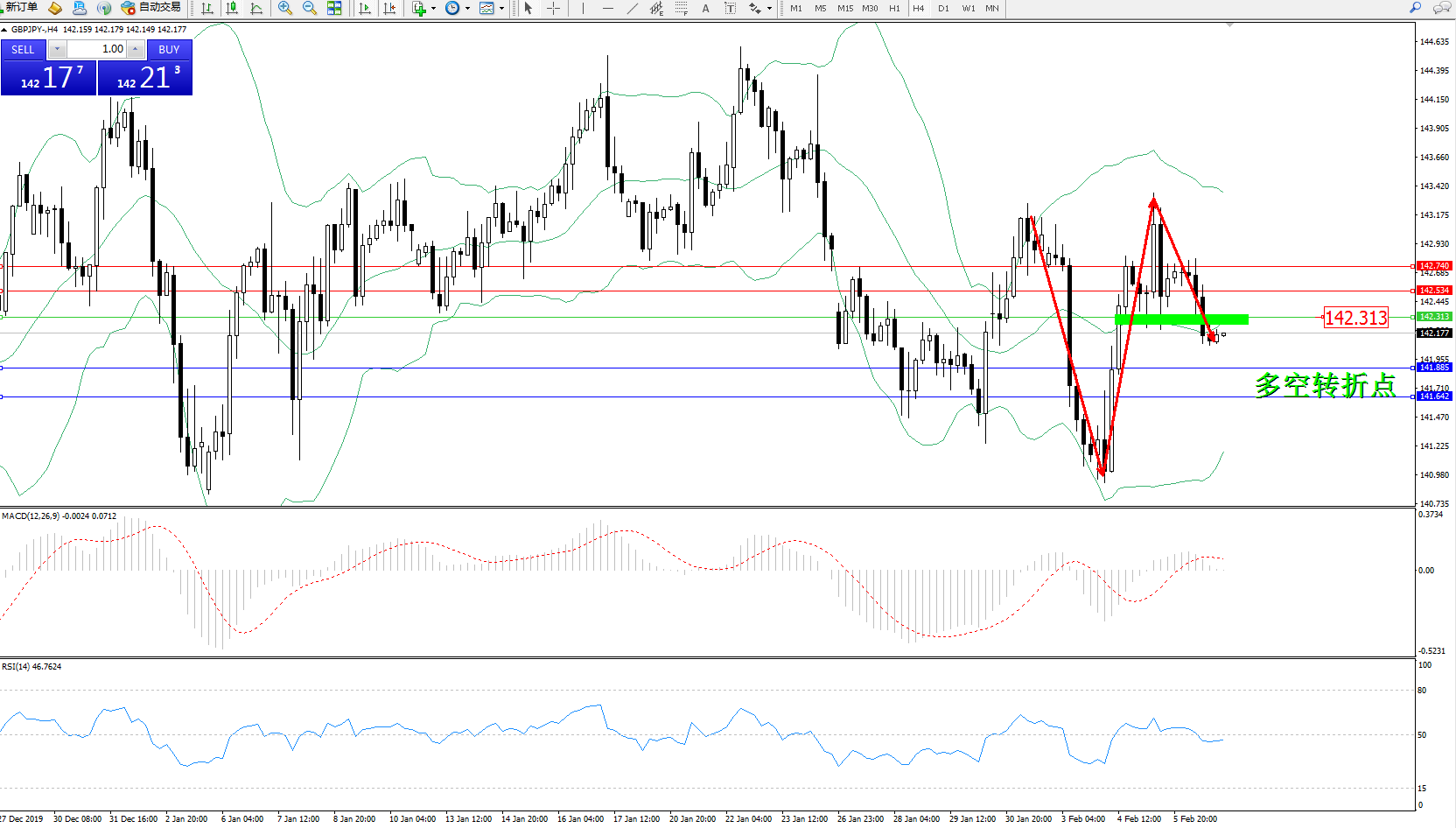 交易策略:142.313下方看跌,目标141.885141.642