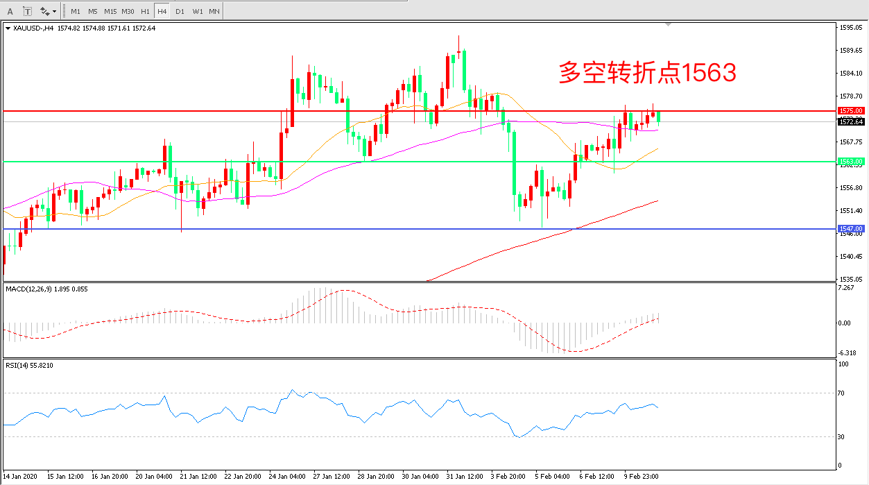 4小时图看,金价触碰1575一线小幅回落,涨势暂缓,均线系统走平, MACD红柱增加,RSI指标走平,近期延续上行概率较大。