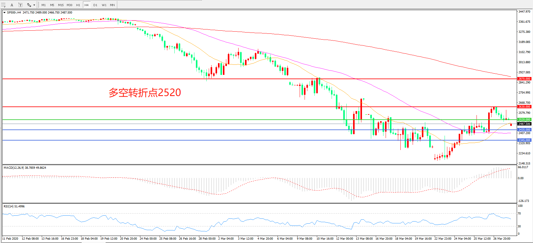 4小时图看,标普500呈现冲高回落走势,2630成为短期阻力,整体表现偏弱,短期均线拐头向上,MACD红柱减少,RSI指标向下,日内延续震荡,概率较大。