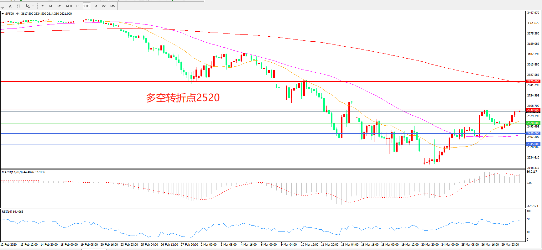4小时图看,标普500震荡反弹,再次临近2630一线,整体表现有所回暖,短期均线拐头向上,MACD红柱增加,RSI指标走平,日内延续震荡概率较大。