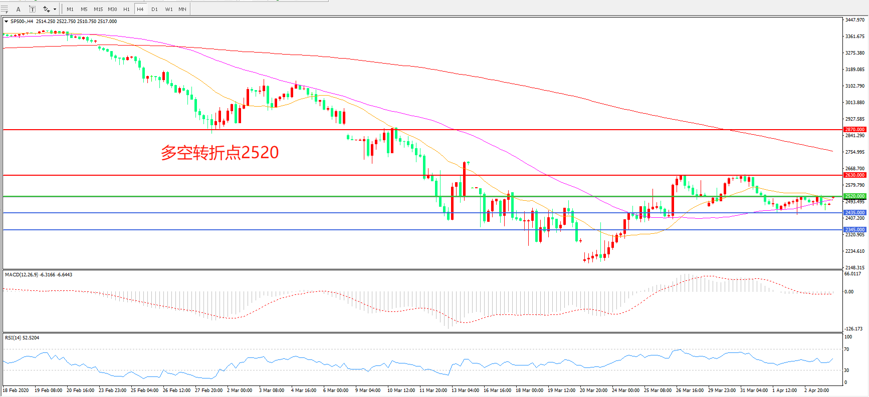 4小时图看,标普500维持窄幅震荡,整体波幅不大,55周期均线被跌破,MACD红柱减少,绿柱增加,RSI指标走平,日内延续震荡概率较大。