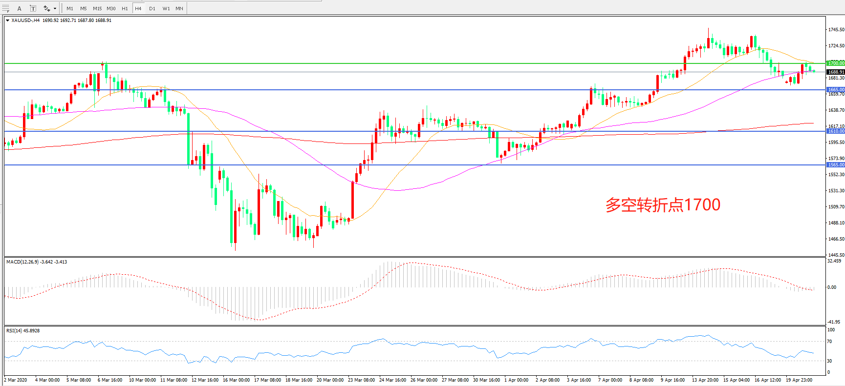 周一(4月20日),油价暴跌引发投资者的避险情绪再度回升,现货黄金小幅走高,收报1690美元/盎司,但考虑美元企稳走高,同时美国重启经济计划仍在继续推进,这令黄金的上行动能略显不足,千七关口能否突破仍是需要关注的重点。