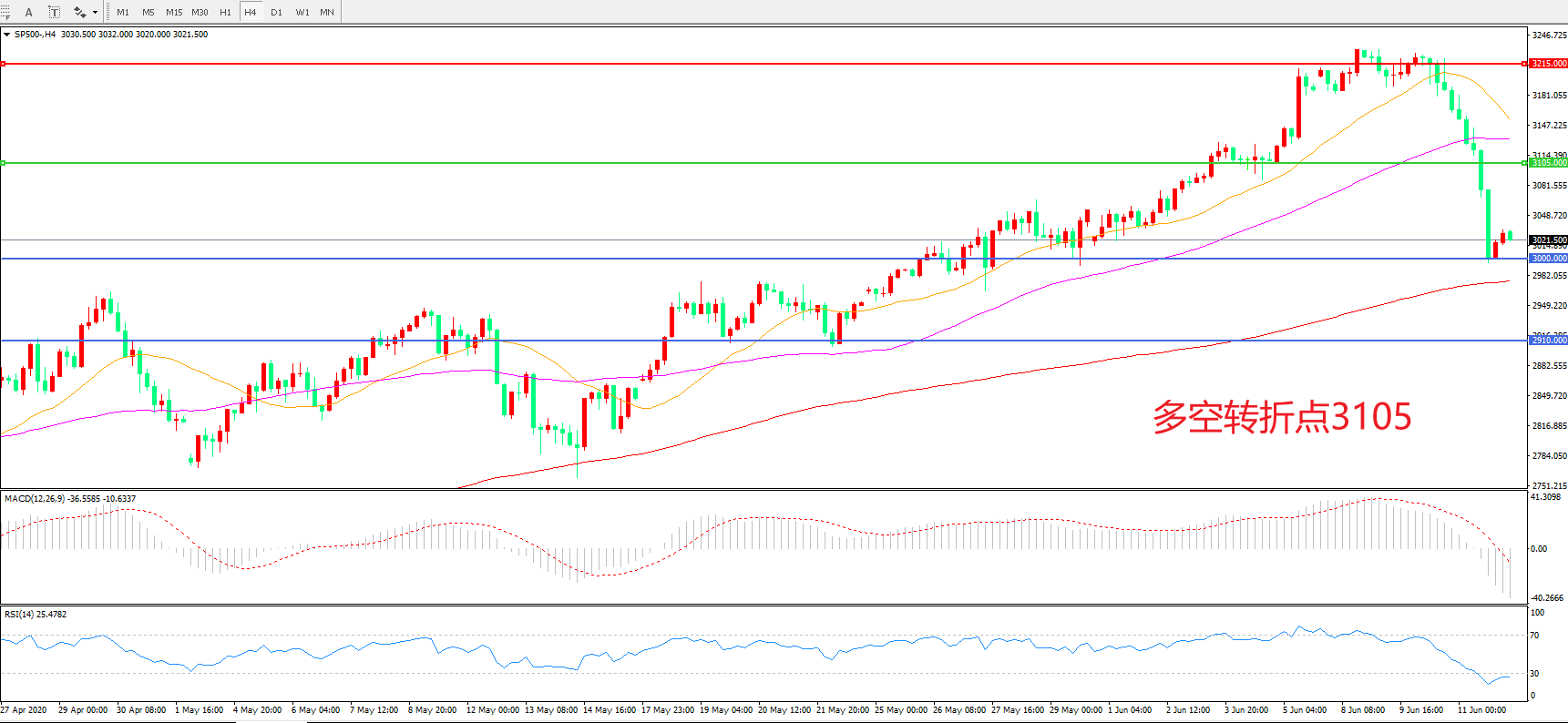 4小时图看,标普500长阴连续下破,整体表现偏弱,3000一线成为短期支撑,短期均线拐头向下,MACD绿柱增加,RSI指标向上,日内震荡下行概率较大。