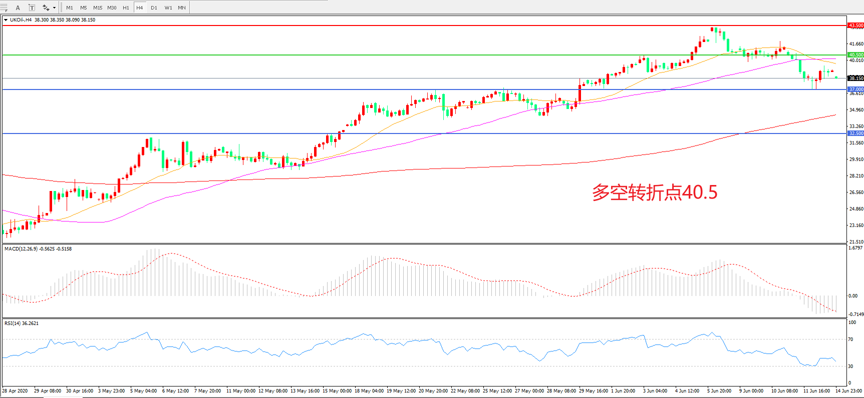 上周,在美联储警告新冠疫情可能会对经济造成长期损害之后,市场风险情绪恶化,油价终结六连涨的步伐,周一(6月15日)布伦特原油跳空低开,截止发稿前,收报38.18美元/桶。眼下油市面临的最大风险仍是疫情二次蔓延的风险,如果近期经济复苏的势头和疫情缓和的势头被证明是暂时的,那么油价将再次遭遇抛售。