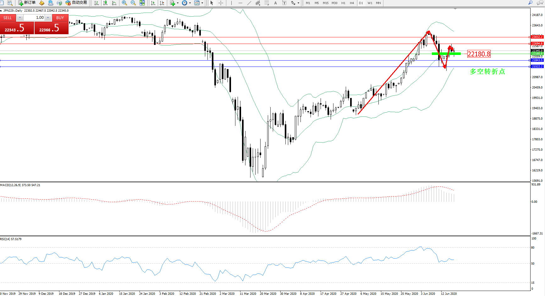 日经225指数6月18日(周四)收盘下跌99.26点,跌幅0.44%,报22356.50点。日本政府周五将取消所有国内旅行限制,希望进入重新开放的下一阶段,包括重新开始各项活动和夜生活。美元走强与全球股市回档的两股势力呈现拉锯,全球避险情绪再度升温;佛罗里达州单日新冠美国感染病例激增,隔夜美股大跌。虽然美联储和特朗普称将推出进一步刺激计划,但却都是“雷声大雨点小”,美股因此面临进一步下滑风险。 美国经济复苏需要很长时间,美联储将不得不维持非常宽松的货币政策直至2023年,以帮助经济复苏。病毒检测阳性率升至4月以来的新高。对于全球疫情发展前景再起顾虑,并同时看衰经济前景,尤其是在有消息显示美国总统特朗普的1万亿美元基建计划可能在国会遭遇阻力的背景下。此外,全球地缘局势的进一步发酵也备受瞩目。
