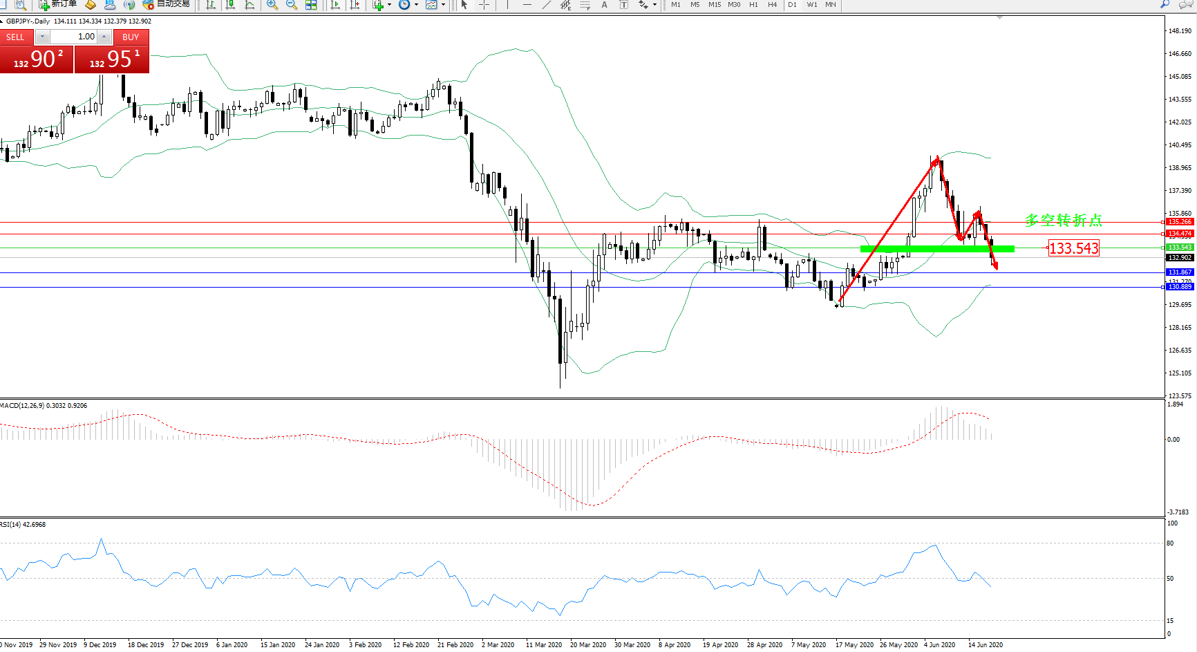 技术点评:高位空头动力持续震荡下行态势良好,触及布林带指标中轨附近得到短期支撑开始回升,但下行动力强劲,下行趋势未能止步,处于布林带指标中下轨区间继续下探中,布林带指标呈收口状态中,下轨附近的支撑节点近期或将触及,MACD指标处于多头区域弱势震荡下行至0轴线附近徘徊,RSI指标空头动力继续下行至50均衡线附近徘徊后进入空头区域继续下行中;