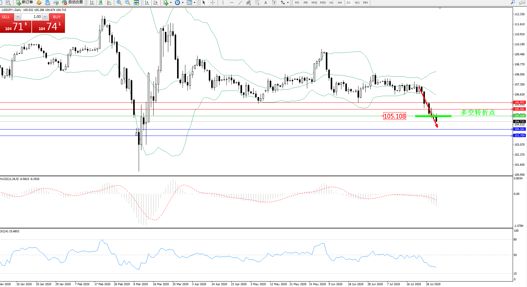 美元兑日元跌幅扩大到0.21%,创3月13日以来新低至104.70。美元兑日元下行三角形态暗示跌势恐将延续,目标指向100.72;美联储7月利率决议几乎没有改变外汇市场的整体心理,美元疲软的预期依然根深蒂固,更倾向于关注那些落后于美元疲软走势的货币,因此仍关注美元兑日元下行。考虑到新冠病毒事件正在美国各地肆虐,对美元储备货币地位不利。如果说美联储7月决议有什么影响的话,那就是只会强化已经占据市场心理的美元疲软前景论调。因美元指数跳水,美国总统特朗普询问选举是否应该推迟到投票安全的时候,此外据NBC:美国食品药品监督管理局(FDA)负责人表示,“可能的”疫苗将在2020年底投入使用。但日本疫情也在恶化,此外日本的外向型经济也受到疫情冲击。日本下调2020财年实际GDP预测,预计GDP将萎缩4.5%左右。日本政府预计到2021财年日本实际GDP增速约为3.4%。日本称,如果海外出现第二次大规模冠状病毒疫情,2020财年日本实际GDP可能收缩5%左右。而日本财务省官员表示,如果日元走强,考虑各种政策工具。