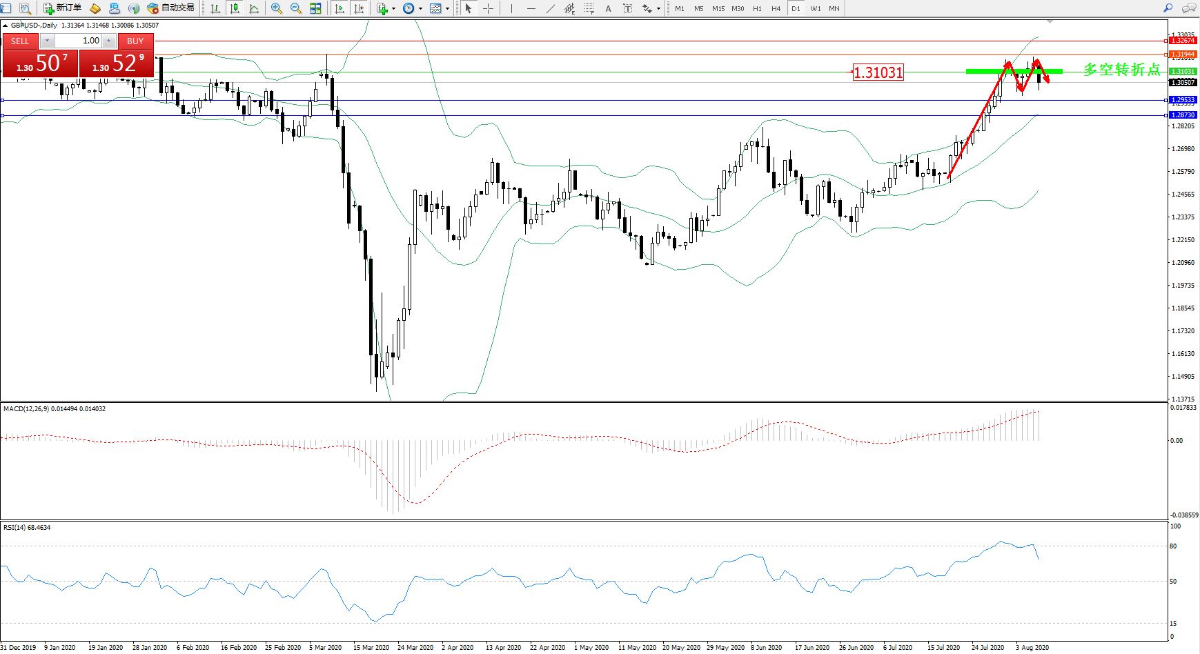 交易策略:1.31031下方看跌,目标1.29533、1.28730