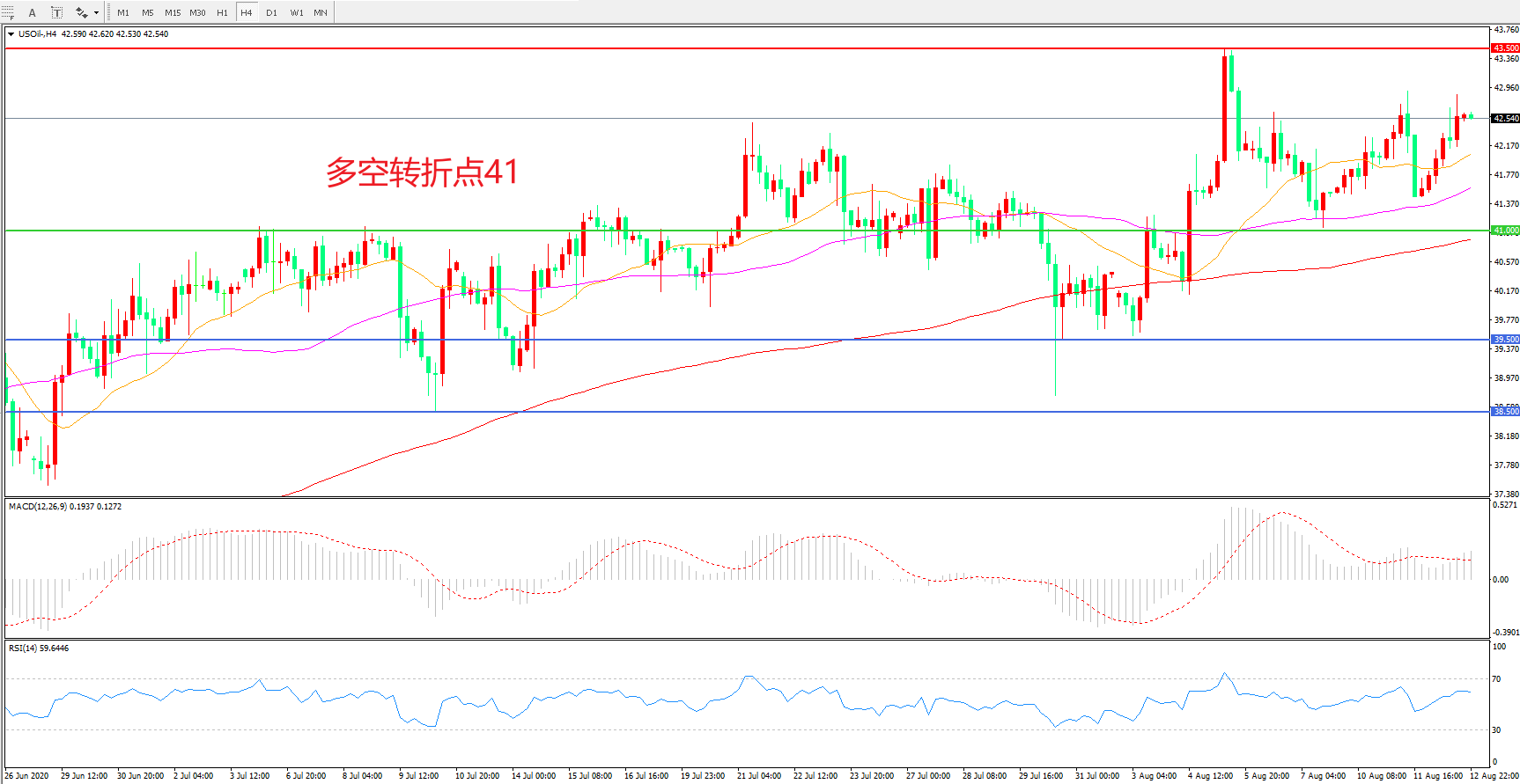 4小时图看,油价延续宽幅震荡,短期波动放大,55周期均线成为下方支撑,43.5美元成为上方阻力,MACD红柱较少,RSI指标走平,日内延续上行概率较大。