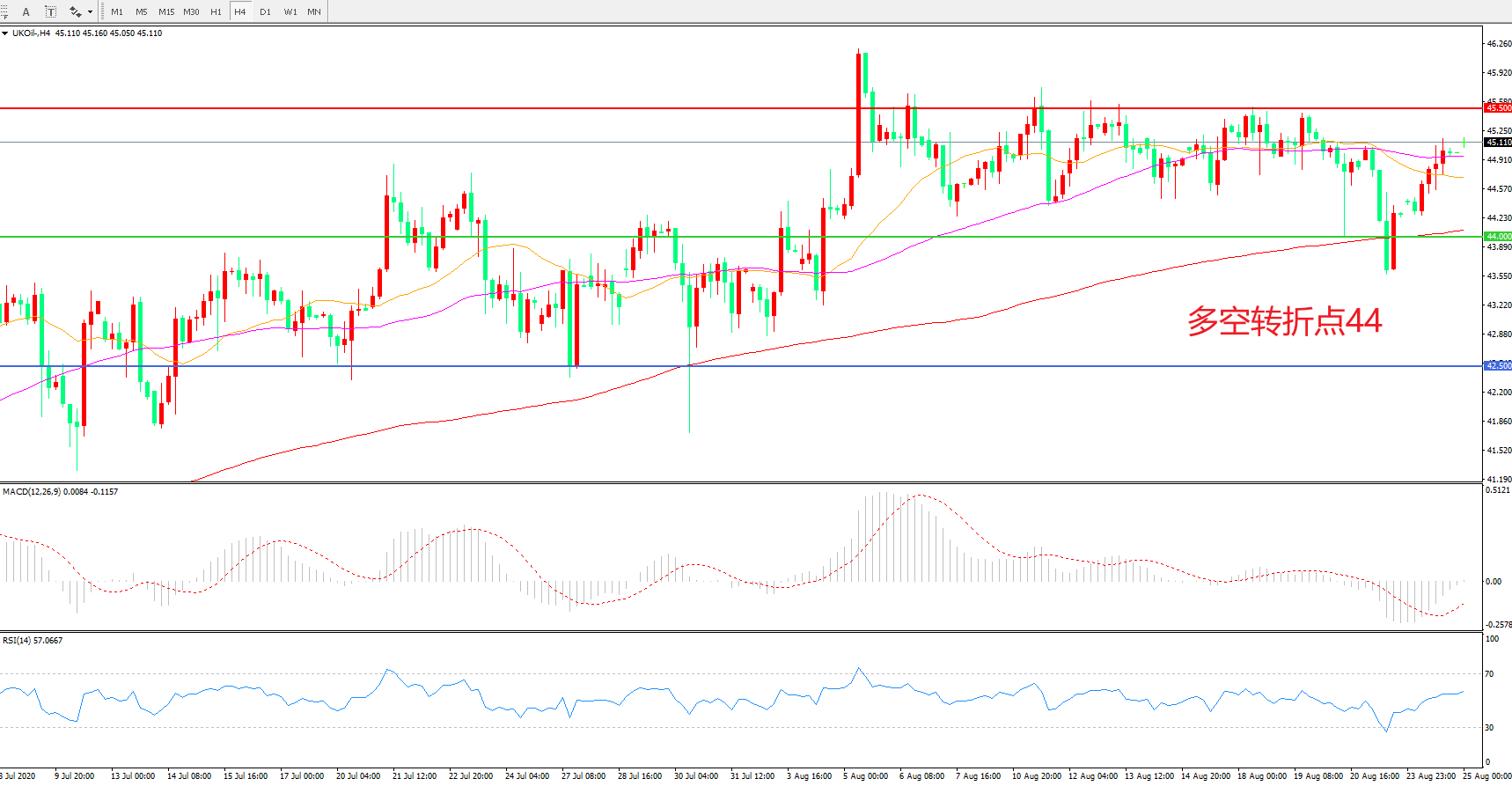 小时图看,油价呈现宽幅震荡形态,44美元一线成为短期支撑,短期均线系统走平成为上方阻力,MACD绿缩短,RSI指标走平,日内延续震荡概率较大