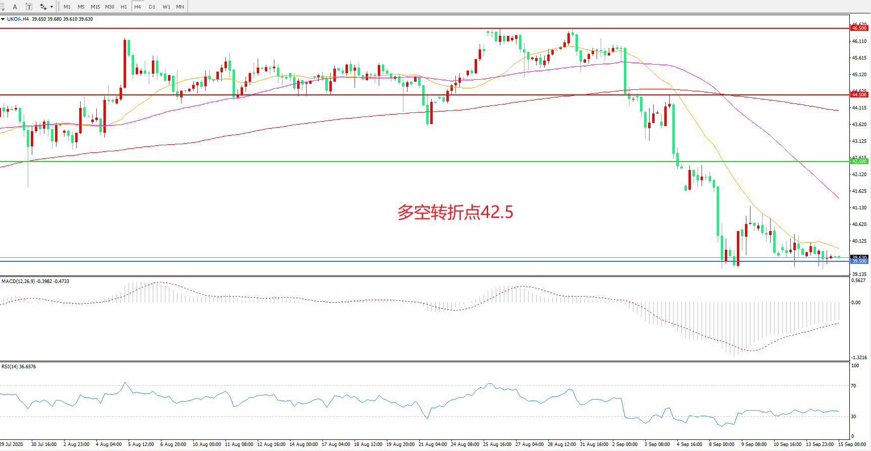4小时图看,油价延续低位震荡,整体走势偏弱,21周期均线成为短期阻力,39.5美元成为短期支撑,MACD绿柱缩短,RSI指标走平,日内延续震荡概率较大。