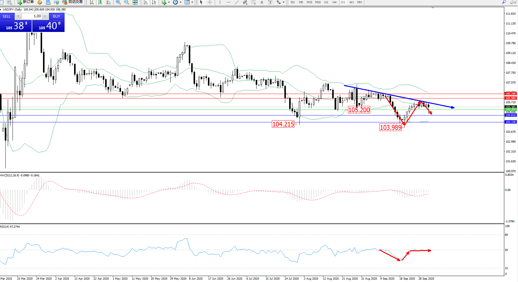 美元兑日圆弱势下挫跌破105大关,触及9月23日以来的一周半新低104.94,后市或随避险情绪发酵进一步下挫。因美国总统特朗普夫妇被确诊感染新冠病毒的消息,令市场避险情绪急剧升温,美国大选选情变数因此进一步增加,也让本来选择持有美元现金避险的投资者改换门庭,重新买入日元资产。另外,美国9月非农不及预期,就业市场不容乐观,全球经济复苏脚步正在放缓。美国财政协议可能在高层“群龙无首”的背景下充满更多变数,因为直到目前为止,白宫方面还在施压要求尽快通过援助协议,而参院共和党人则对此表现得不甚积极。如果特朗普总统暂时淡出权力一线,谈判进程可能被进一步拖延至大选投票日后,这对于风险资本市场是显著的利空。