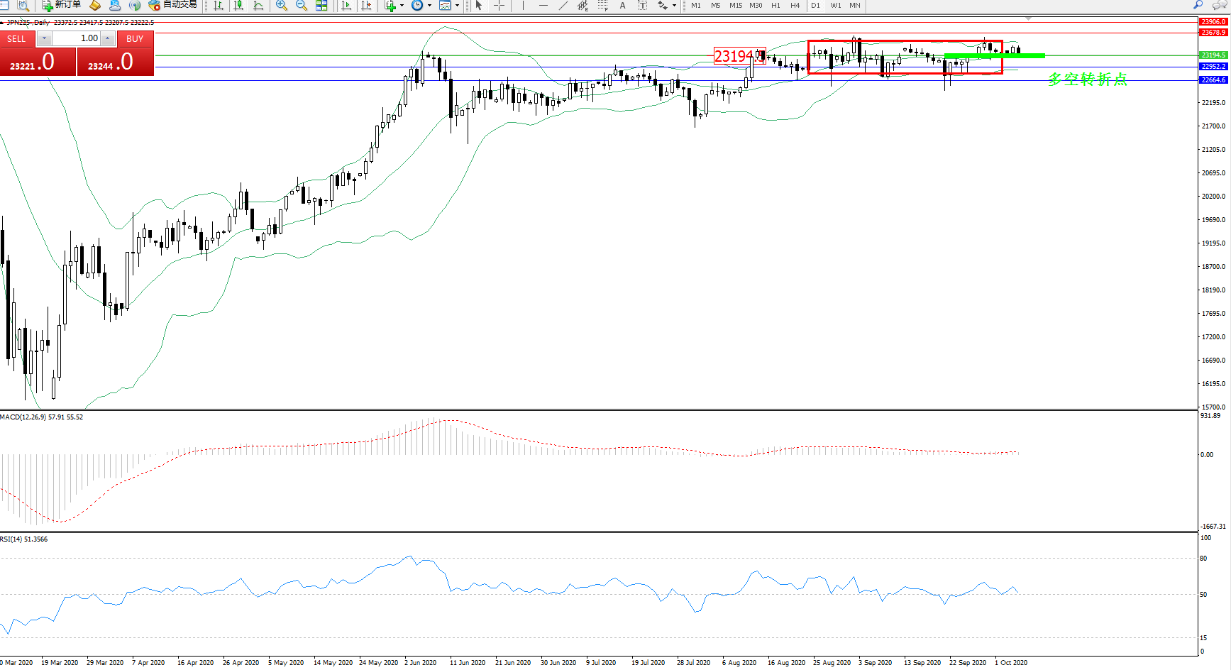 日经225指数10月6日(周二)收盘上涨118.36点,涨幅0.51%,报23430.50点。避险货币依旧走高,美元指数弱势依旧,特朗普病情好转出院的消息仍在发酵,市场恐慌情绪不断消散,全球股市也有所反弹,但围绕美国大选的不确定性依旧带来避险需求,另外,特朗普准备下周再次跟民主党候选人乔·拜登辩论。此外,全球疫情形势依旧严峻,全球经济仍存停滞风险。日本外相茂木敏充6日在东京都内与访日的美国国务卿蓬佩奥举行会谈,就强化日美同盟达成一致。这是两人在菅义伟政府9月起步后首次会面。蓬佩奥强调:“日美关系是地区安全、和平的基础。”希望特朗普和他的妻子早日康复。预算将集中于刺激私人需求。必须与有共同愿景的国家深化合作。