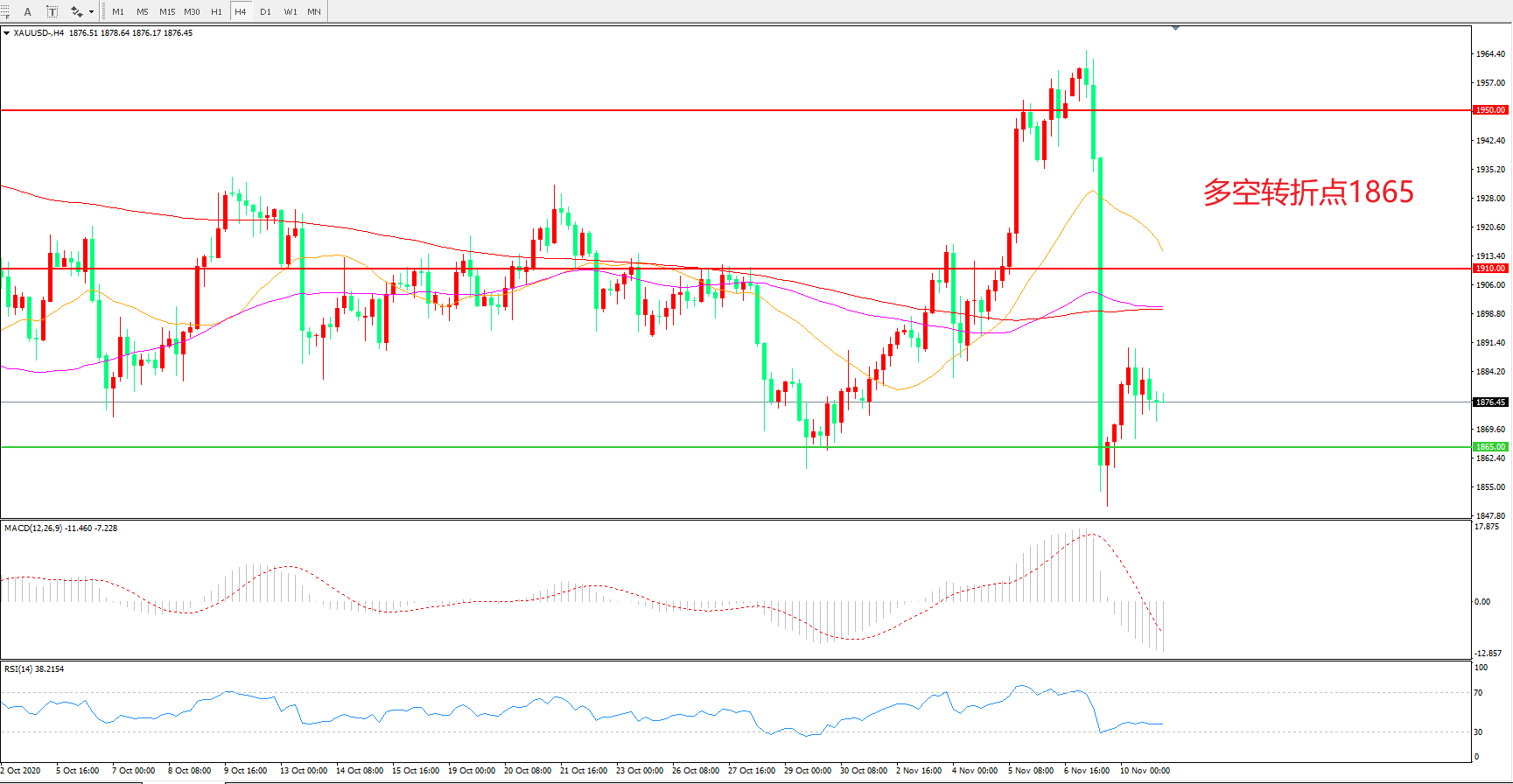周二(11月10日),新冠疫苗取得阶段性进展,市场风险偏好大增,金价大幅下挫后,延续低位震荡,收报1876美元/盎司。但疫苗何时真正投放市场存在不确定性,经济形势依然严峻的情况下,美联储料被迫重新承担起刺激经济的重任,中期来看对金价不宜过分看空。