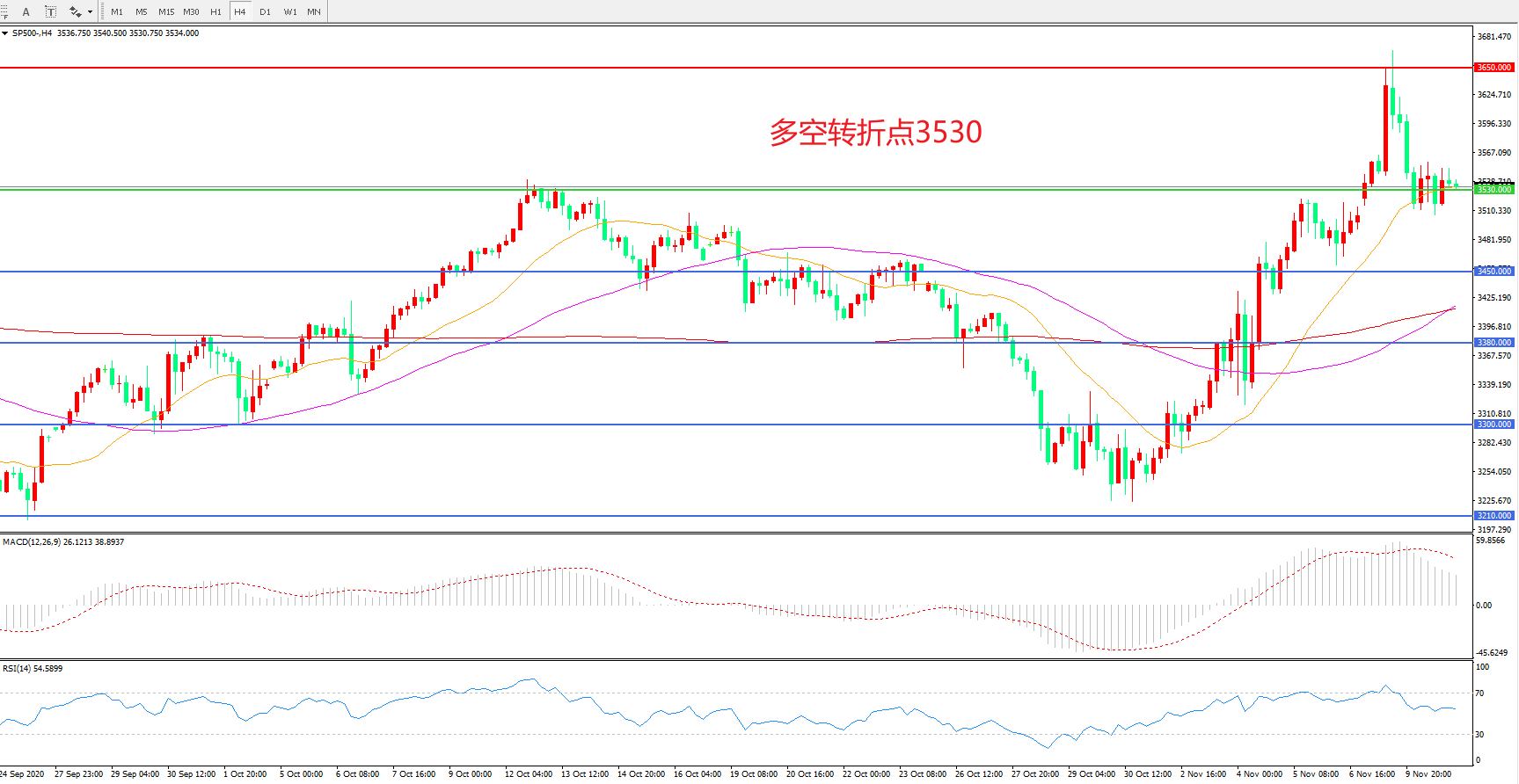 周二(11月10日),在经历了前一日的疯狂上涨后,美股走势出现分化,因疫情受损的板块在疫苗消息推动下出现反弹,而受益于疫宽松流动性环境的科技板块则出现下跌。因为一旦疫苗成功上市,全球经济将转向复苏,虽然有利于企业盈利的回暖,但宽松的政策很可能会逐步退出,不利于成长股估值的提升。标普500冲高回落,收报3546点。
