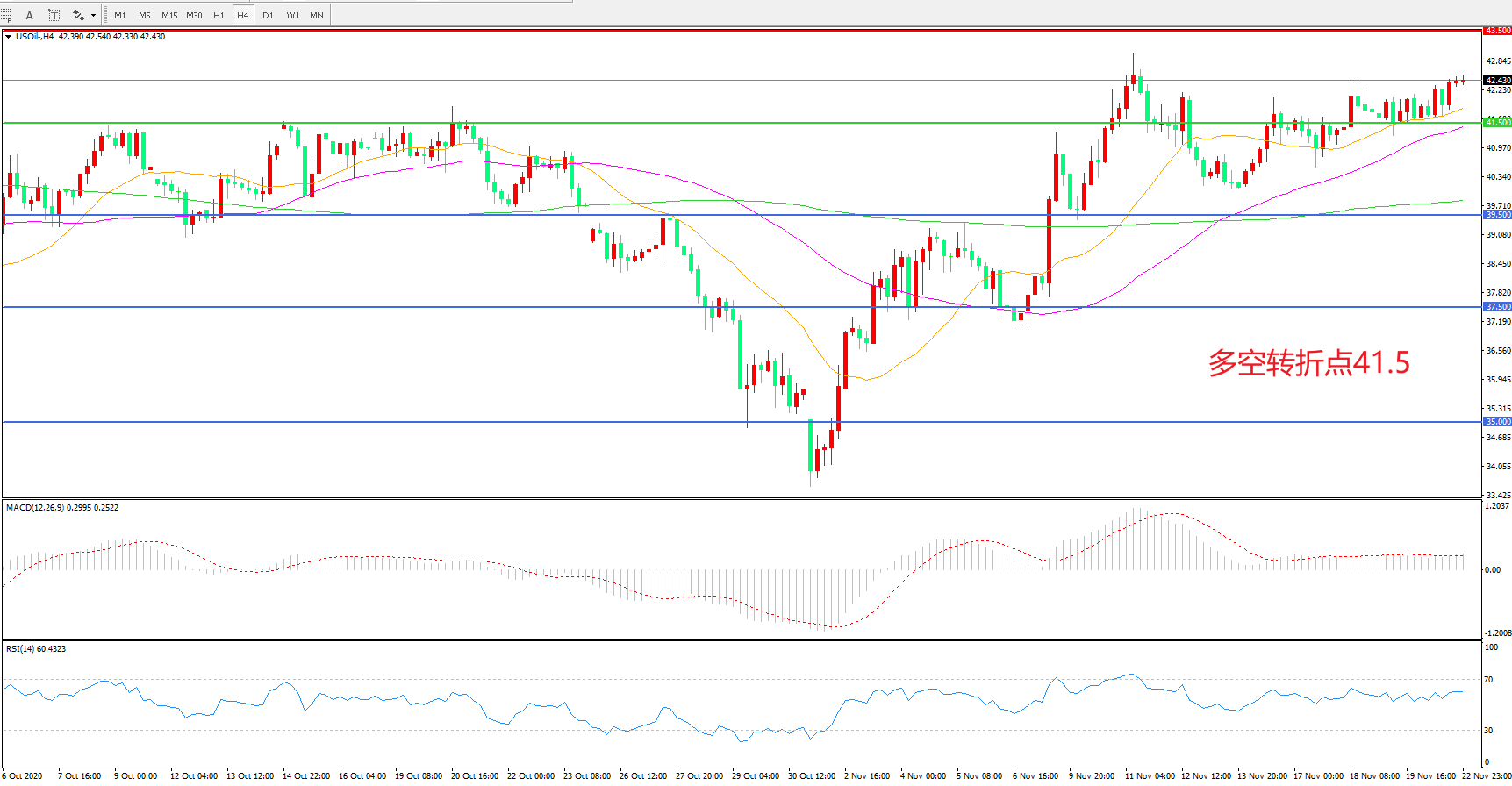 4小时图看,油价延续高位震荡,低点逐渐抬高,短期表现有所回暖,41.5成为多空分水岭,21周期均线成为短期支撑,MACD红柱增加,RSI指标走平,日内震荡上行概率较大。